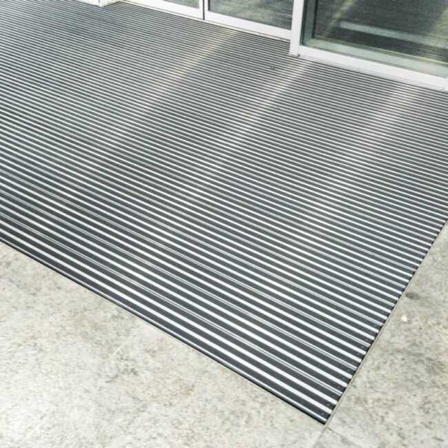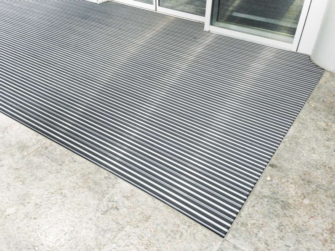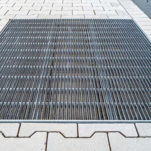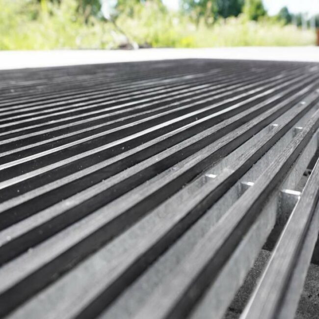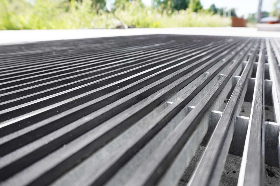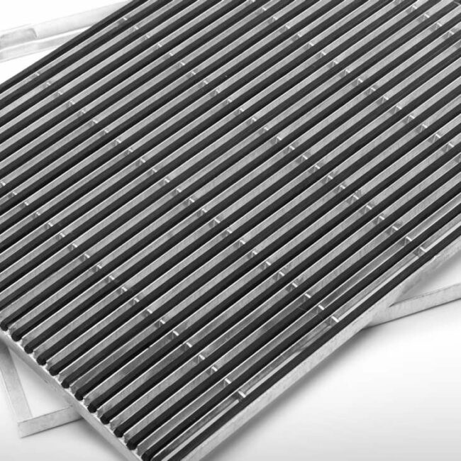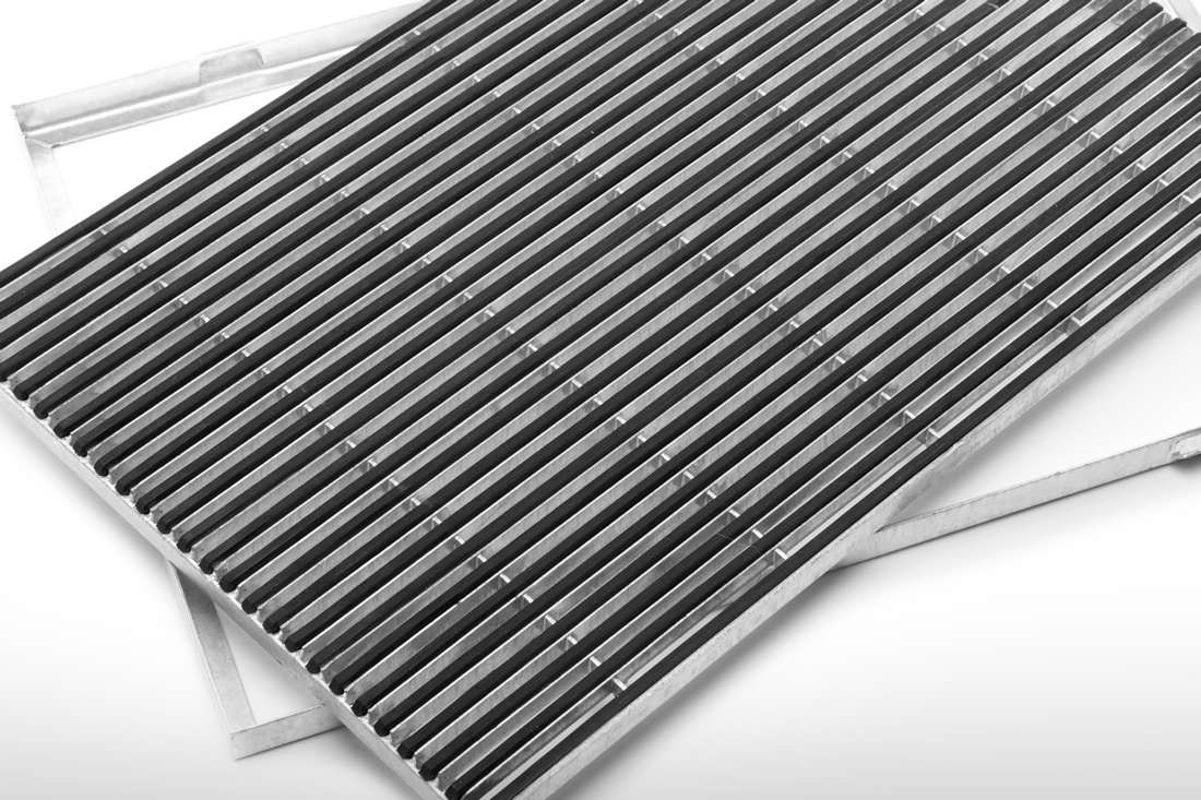 Stabile, wetterbeständige und feuerverzinkte Gummiprofilroste verbinden den Reinigungseffekt einer Eingangsmatte mit der Durchlässigkeit eines Gitterrostes. Besonders interessant ist die freitragende Verlegung von bis zu 1,20 m Stützweite, wohingegen Eingangsmatten komplett aufliegen müssen.