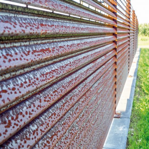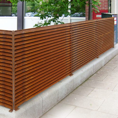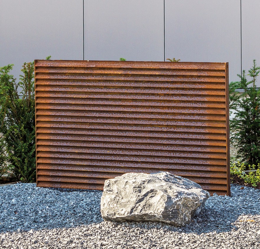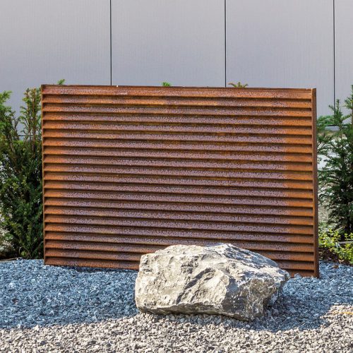 Durch den Alterungs- und Oxidationsprozess des Werkstoffes Cor-Ten S355 JOWP charakterisiert dieses System ein „lebendes“ Material, in dem seine Farben und Nuancen im Laufe der Zeit wechseln. Mittels der schräggestellten Lamellen wird die architektonische Gestaltung mit einem Spiel von Licht und Schatten geschaffen. So entsteht ein elegantes Design für eine zeitlose Architektur.