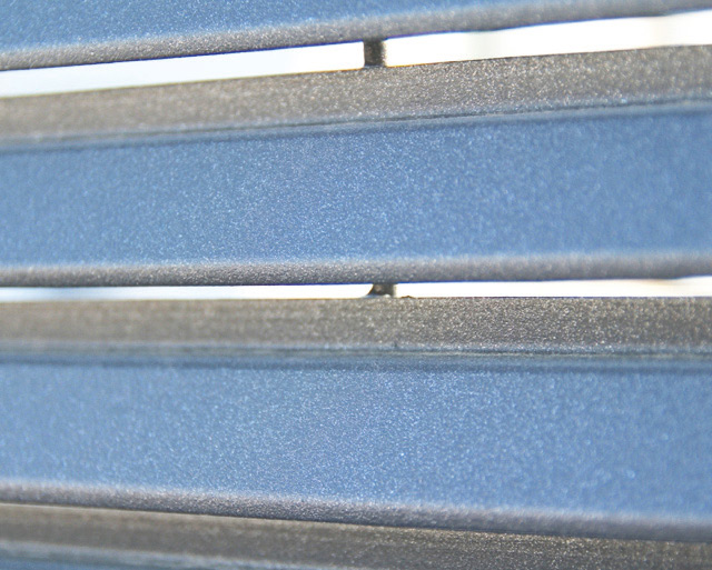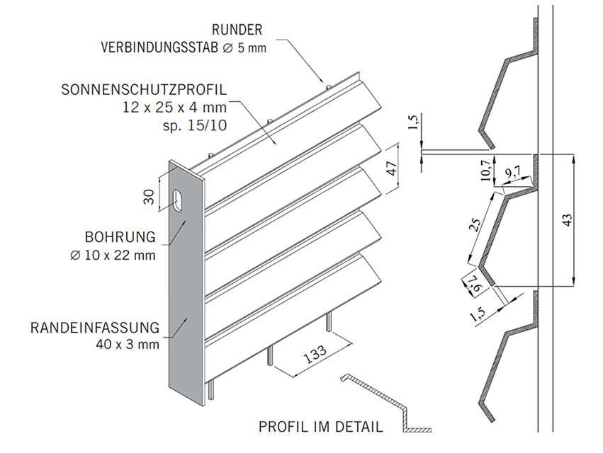 Modulares Zaunsystem, bestehend aus horizontal verlaufenden Tragstäben mit speziellem Sonnenschutzprofil und vertikal verlaufenden Verbindungsrundstäben. Die Randeinfassung oben und unten ist mittels Lichtbogenschweißverfahren verschweißt und garantiert für eine hohe Widerstandsfähigkeit und eine lange Lebensdauer des Produkts. Ein- oder zweiflügelige Dreh- und Schiebetore machen das Zaunsystem Jalou Typ 1 komplett.