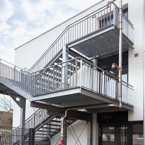 Im Wohnungsneubau und in der Wohnungssanierung finden unsere Gitterrost-Außentreppenanlagen vermehrt Verwendung. Über mehrere Geschosse, mit Laufstegen verbunden, können so verschieden am Haus gelegen, die Wohnungen einzeln begangen werden. Im Prinzip der flexible Ersatz für das klassische Treppenhaus.